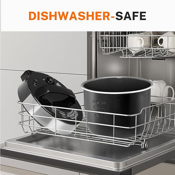 - Dishwasher-safe Design: Cleaning up after cooking has never been easier. The non-stick inner pot prevents food from sticking, while the dishwasher-safe design means you can simply pop the pot and lid into the dishwasher for a hassle-free clean-up