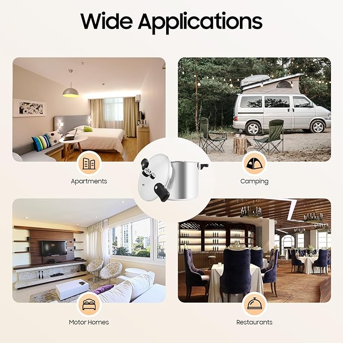 - 【APPLICATION】The stainless steel pressure canner can be used for quick side dishes and is suitable for apartment living, camping, motor homes, and backpacking. It can only be used for gas stoves, electric ceramic stoves, and electric furnaces.